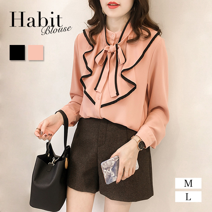 ブラウス レディース 長袖 春 秋 ハビットブラウス リボンブラウス リボン 大人かわいい 上品 エレガント 肌触り抜群 さらっと素材 さらさら 着心地抜群 フリルブラウス フリル 着回し抜群 合わせやすい ピンク ブラック