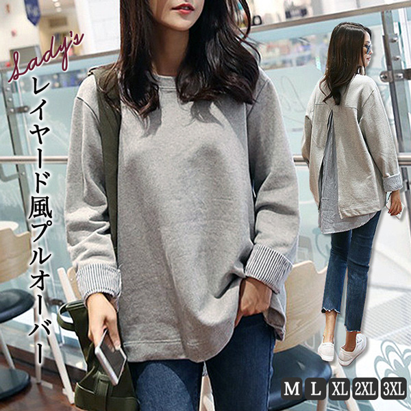 プルオーバー トップス レディース 長袖 レイヤード風 トレーナー グレー サイズ豊富 シンプル レイヤード風プルオーバー 着回し抜群 おしゃれ 大人カジュアル ロングテール裾 抜け感 バックスリット スリット 伸縮性 肌触り抜群 ストライプ