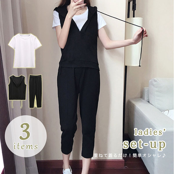 セットアップ レディースセットアップ 3点セット 白Tシャツ ベスト ボトムス 通気性抜群 着心地抜群 フード付きベスト 体型カバー ウエストゴム ポケット付き ゆったりシルエットパンツ モノトーン 白黒 サイズ豊富 シンプル カジュアル