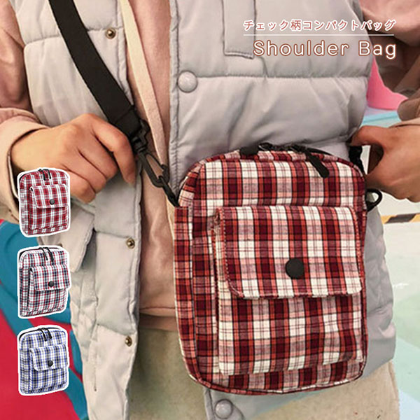 ショルダーバッグ コンパクトバッグ レディース チェック 肩掛け 斜め掛け ダブルジッパー 長さ調節可能 ポーチ ナイロンベルト 外付けポケット 軽量 お出かけ ミニサイズ かわいい アウトドア